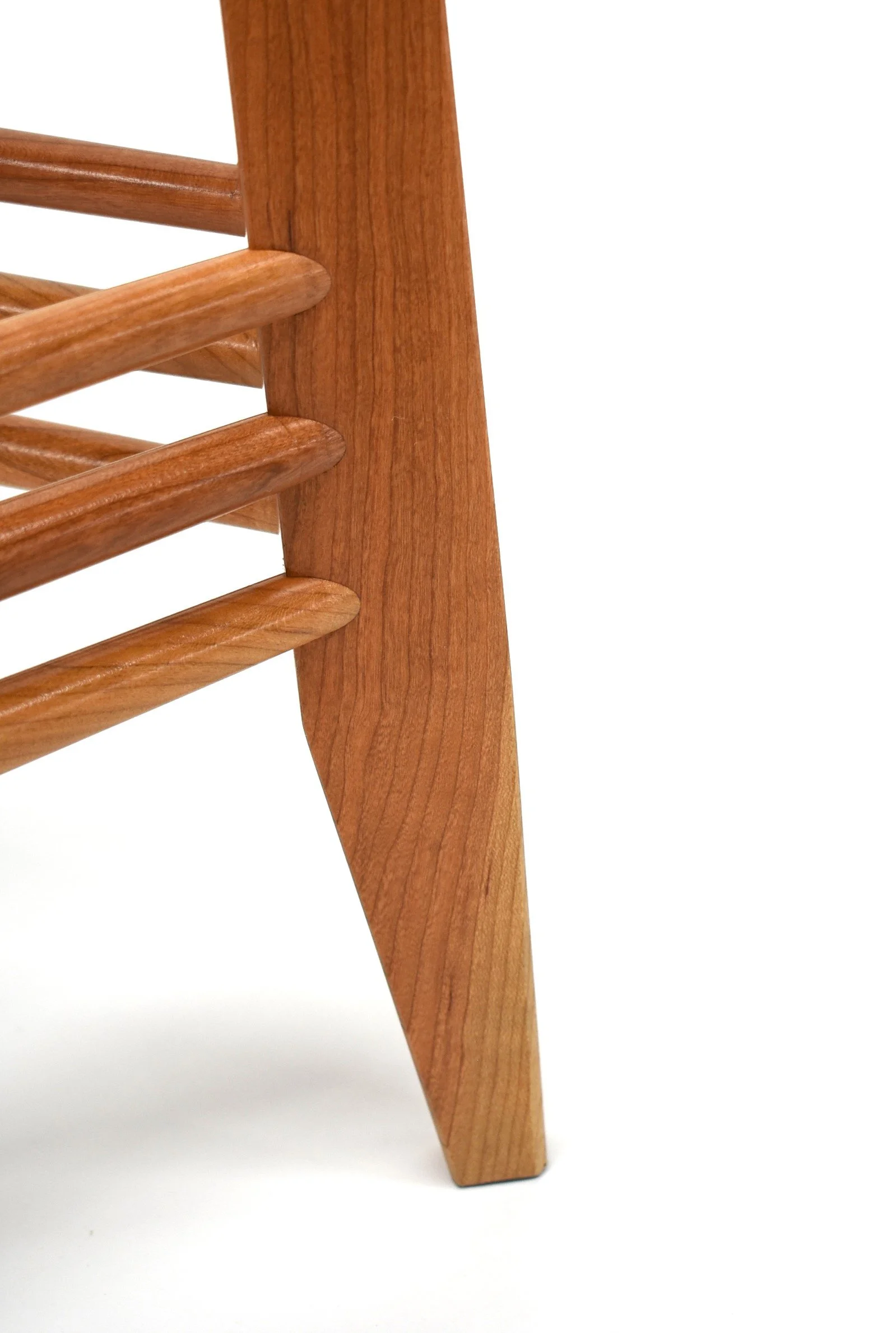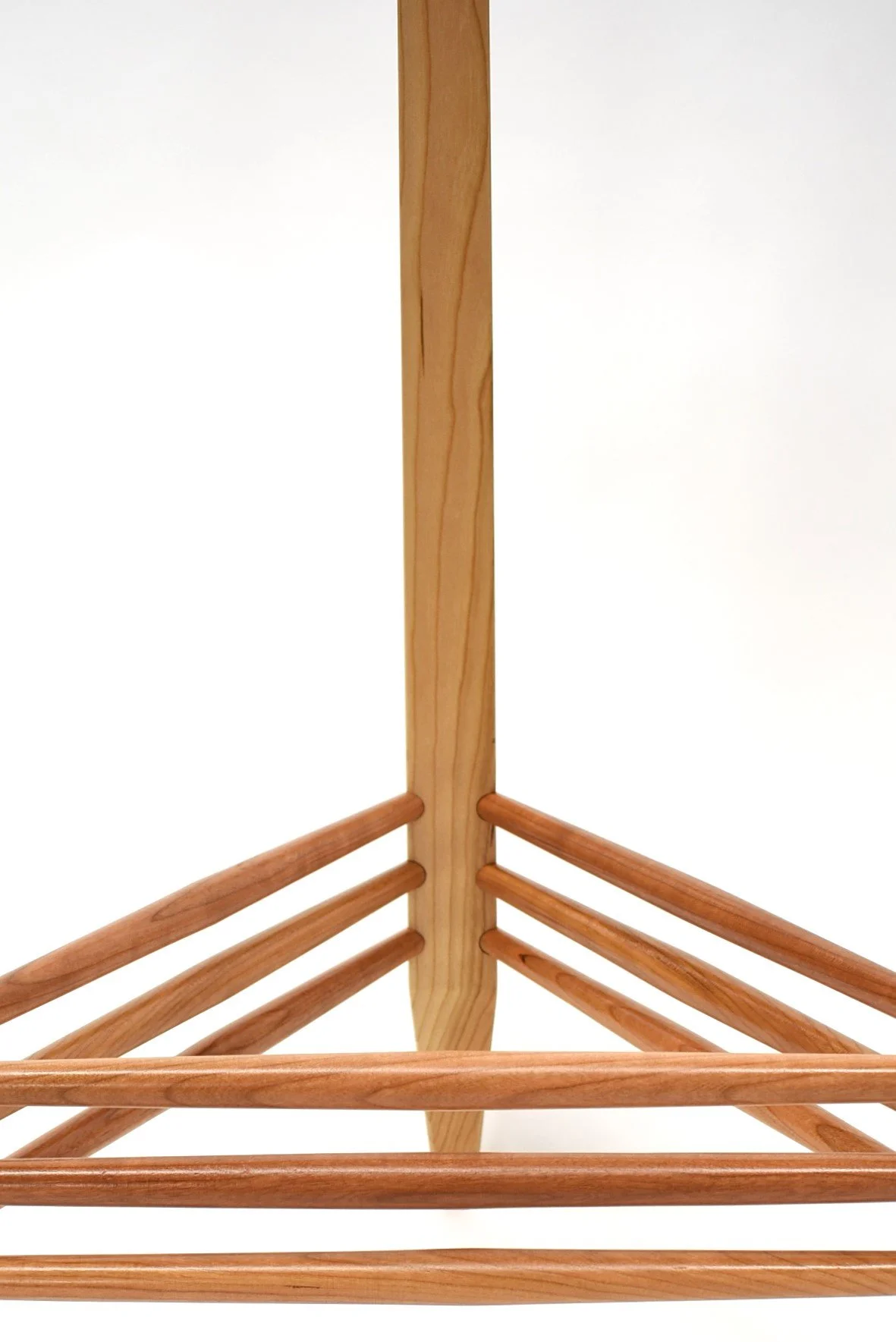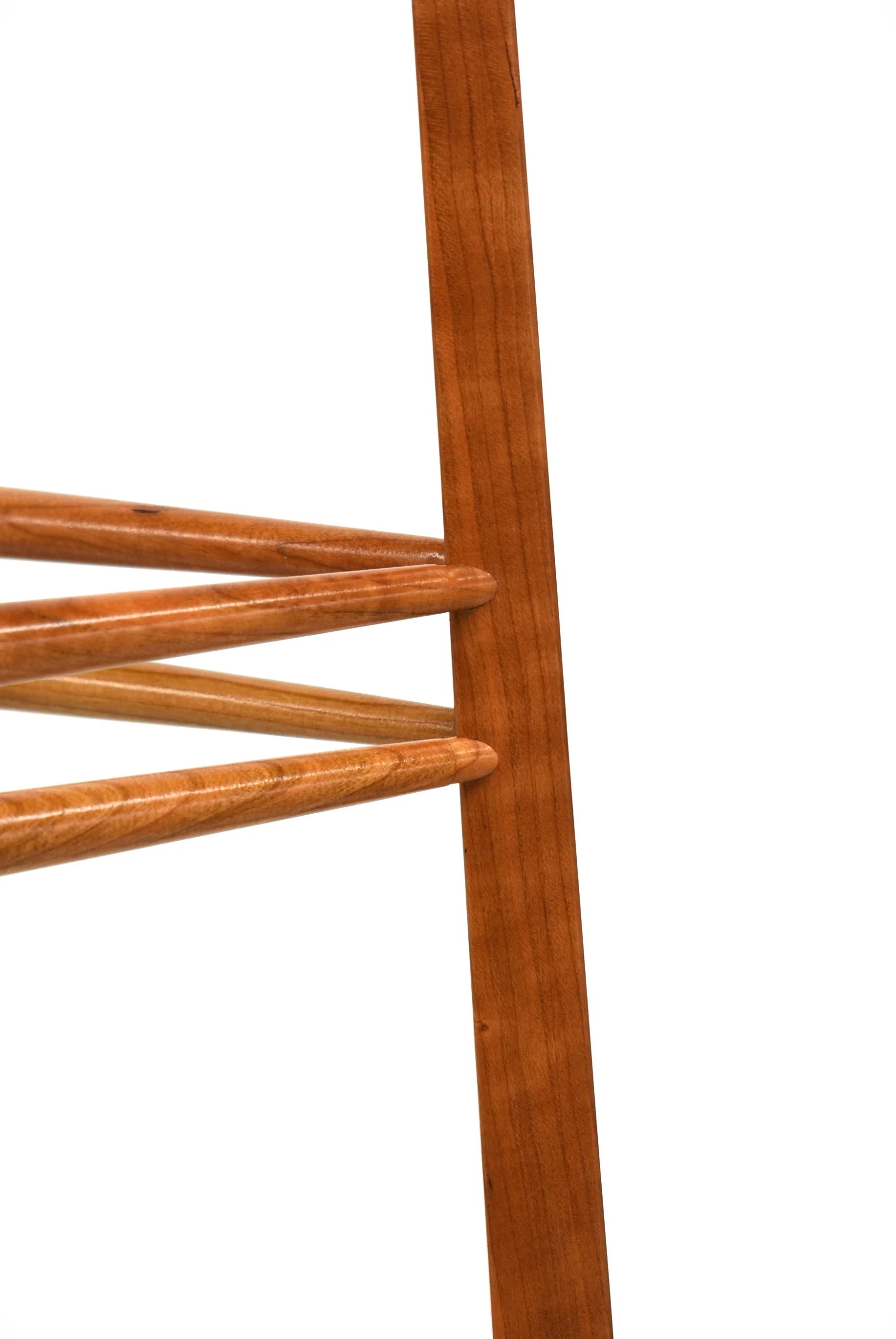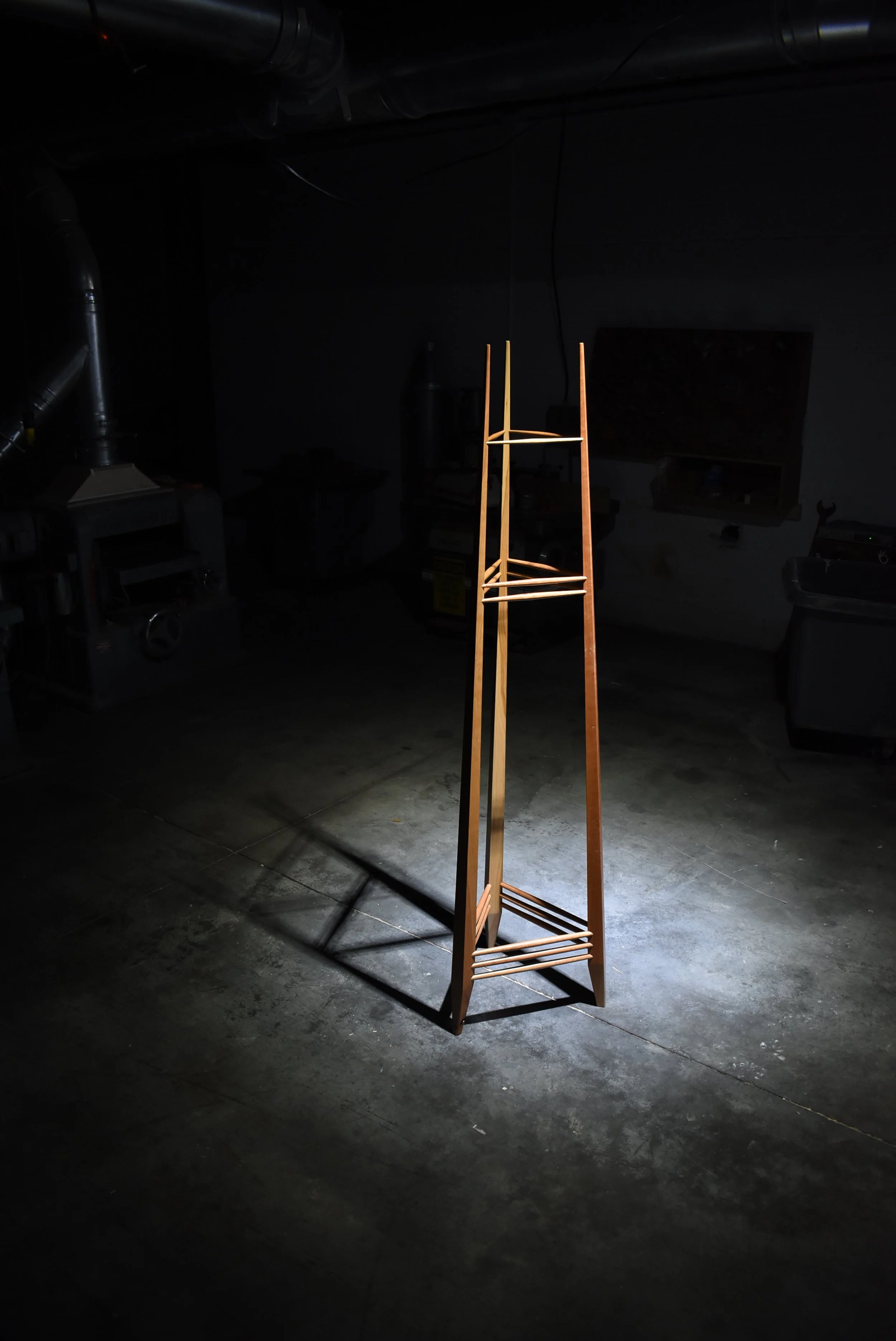 Inspired by the Leaning Stool’s legs and layered stretchers (spindles that keep legs from splaying), this project focuses on extending the structures legs and creating different densities of stretchers, dimensioning is size and frequency as they rise. The extended legs act as hooks for various clothing.