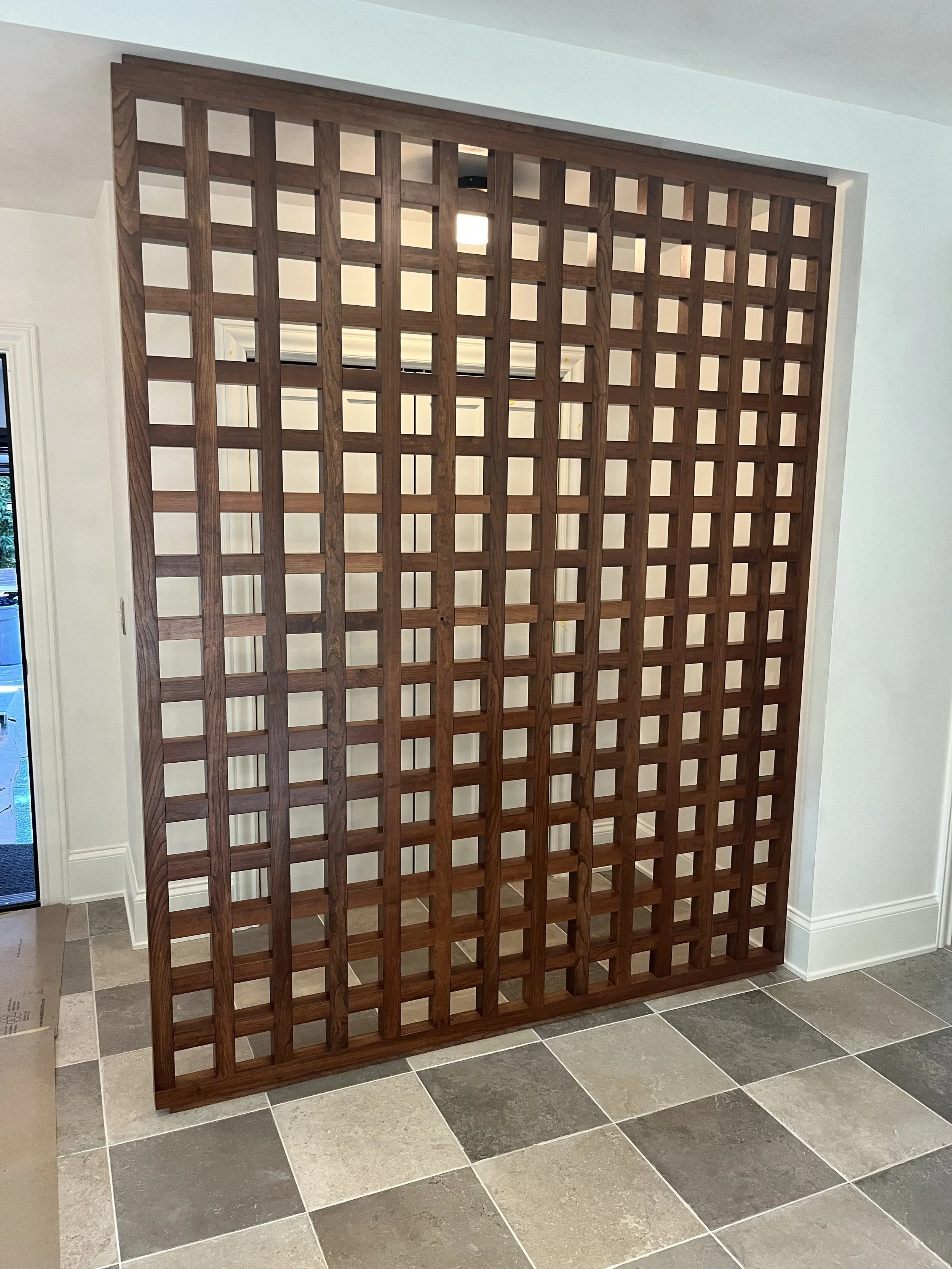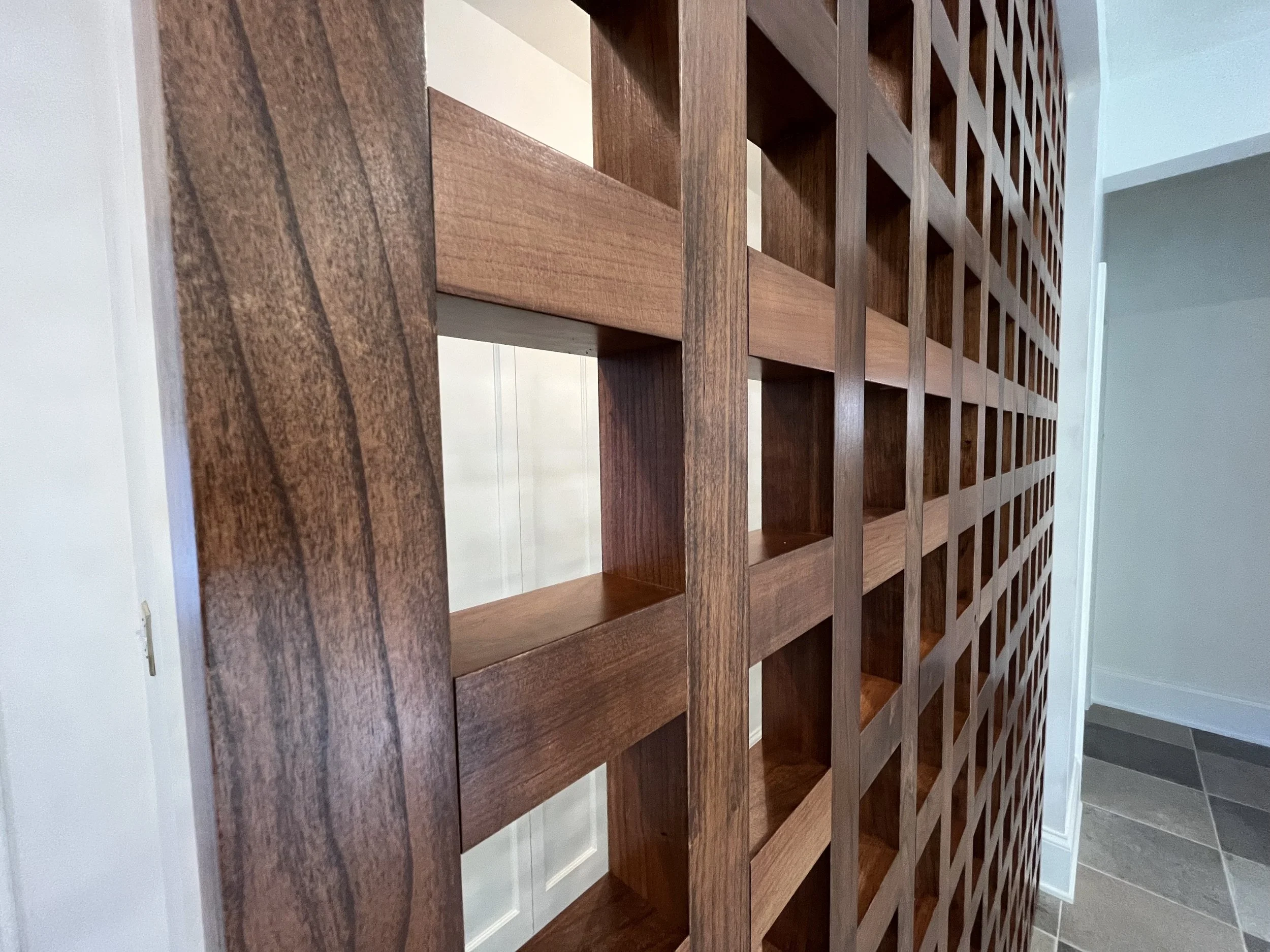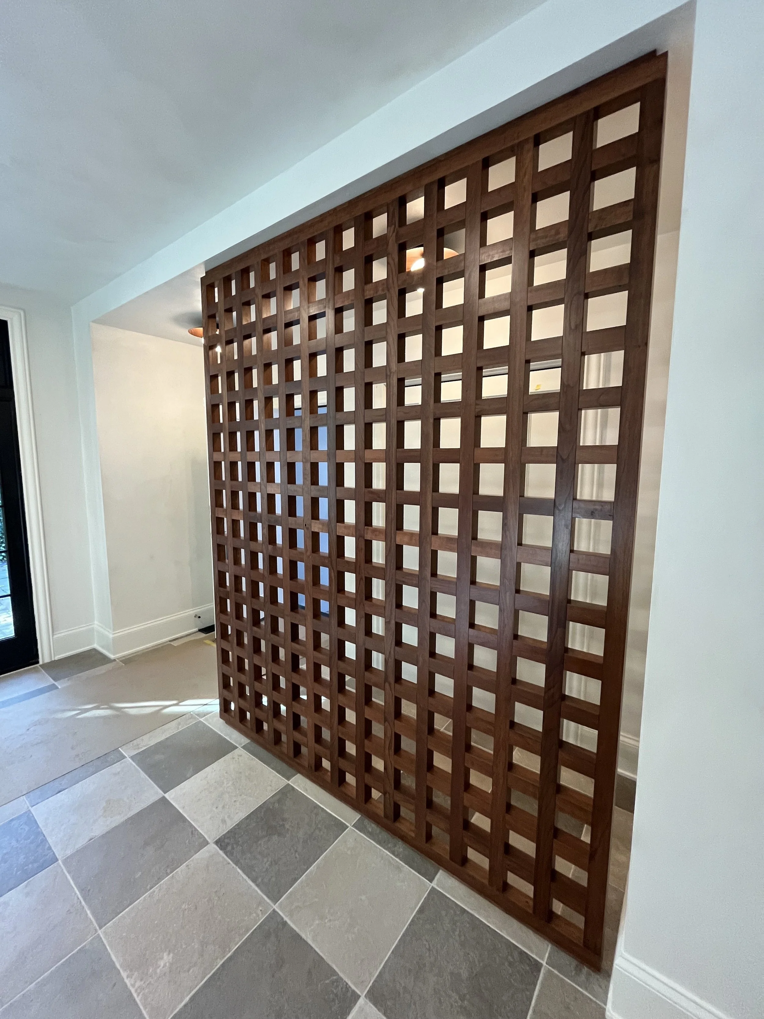 Stained and finished to match the existing millwork, cherry sticks form a dense lattice wall that divides the living area from the entry closet.